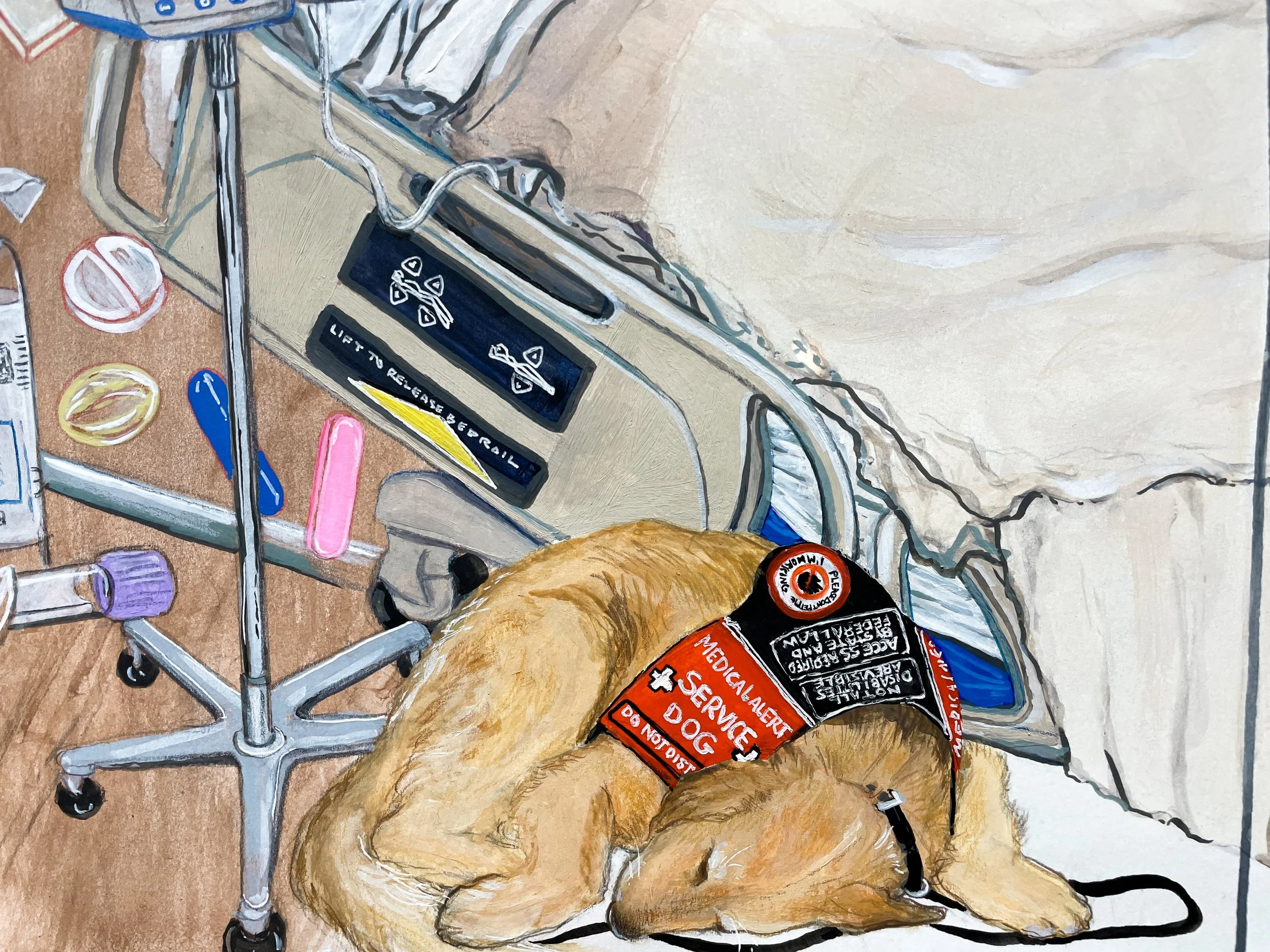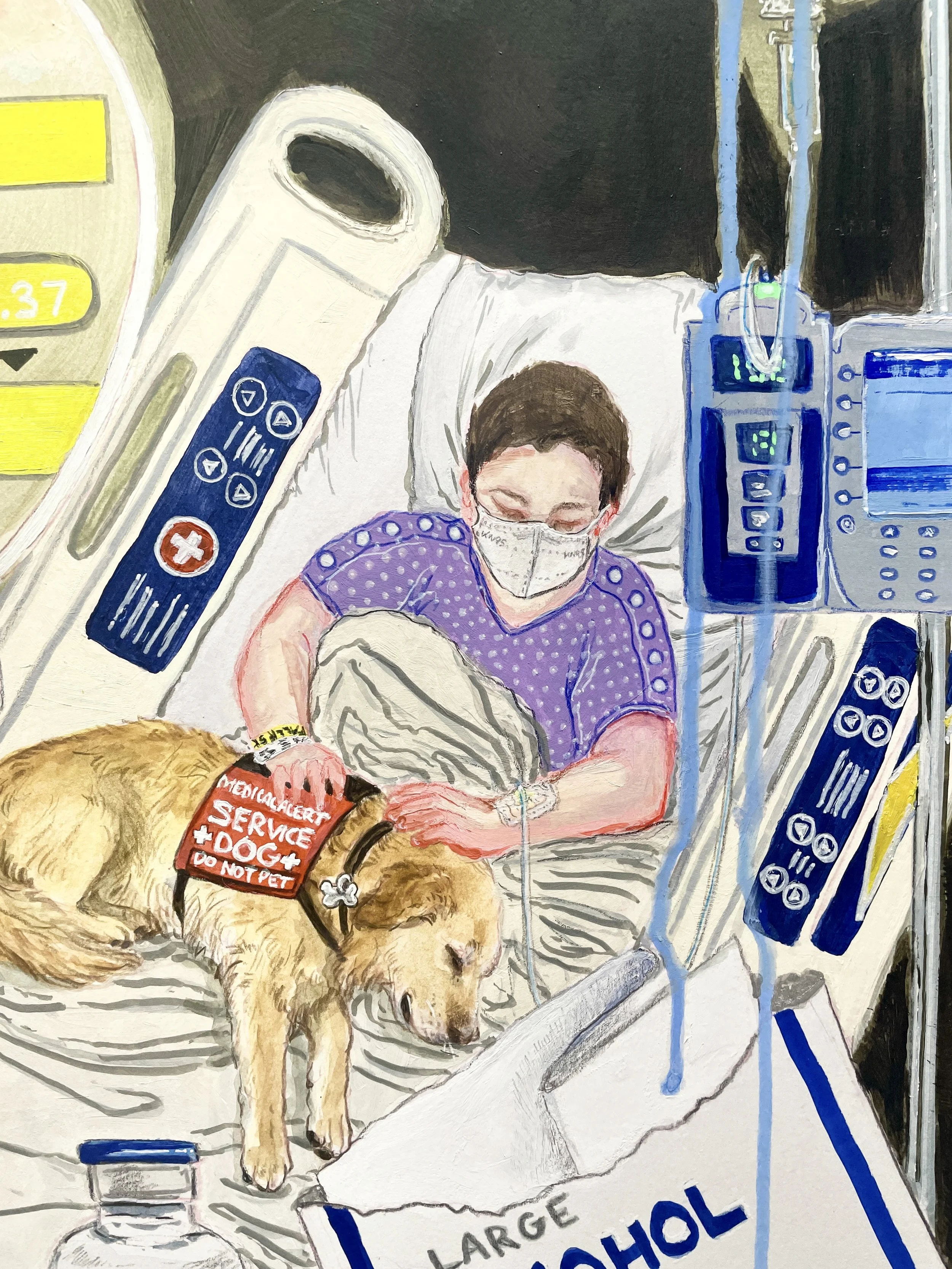 “Bedridden” is a work depicting a time in my life where I was bedridden for the better part of several months due to severe illness and ongoing seizures. During this time, we had brought home my future service dog, Rico, as a puppy, and I needed to rely heavily on my partner, family, and trainer to raise and train him. Due to my unstable health, I was unable to bond with or participate in much of Rico’s training. The experience of the world moving on, and seeing my service dog brought up without me while I laid in bed for months was devastating. Thankfully due to the collective efforts of my support system, Rico was successful in his training, and was even able to provide medical alerts for various episodes (including my seizures), making life more livable.