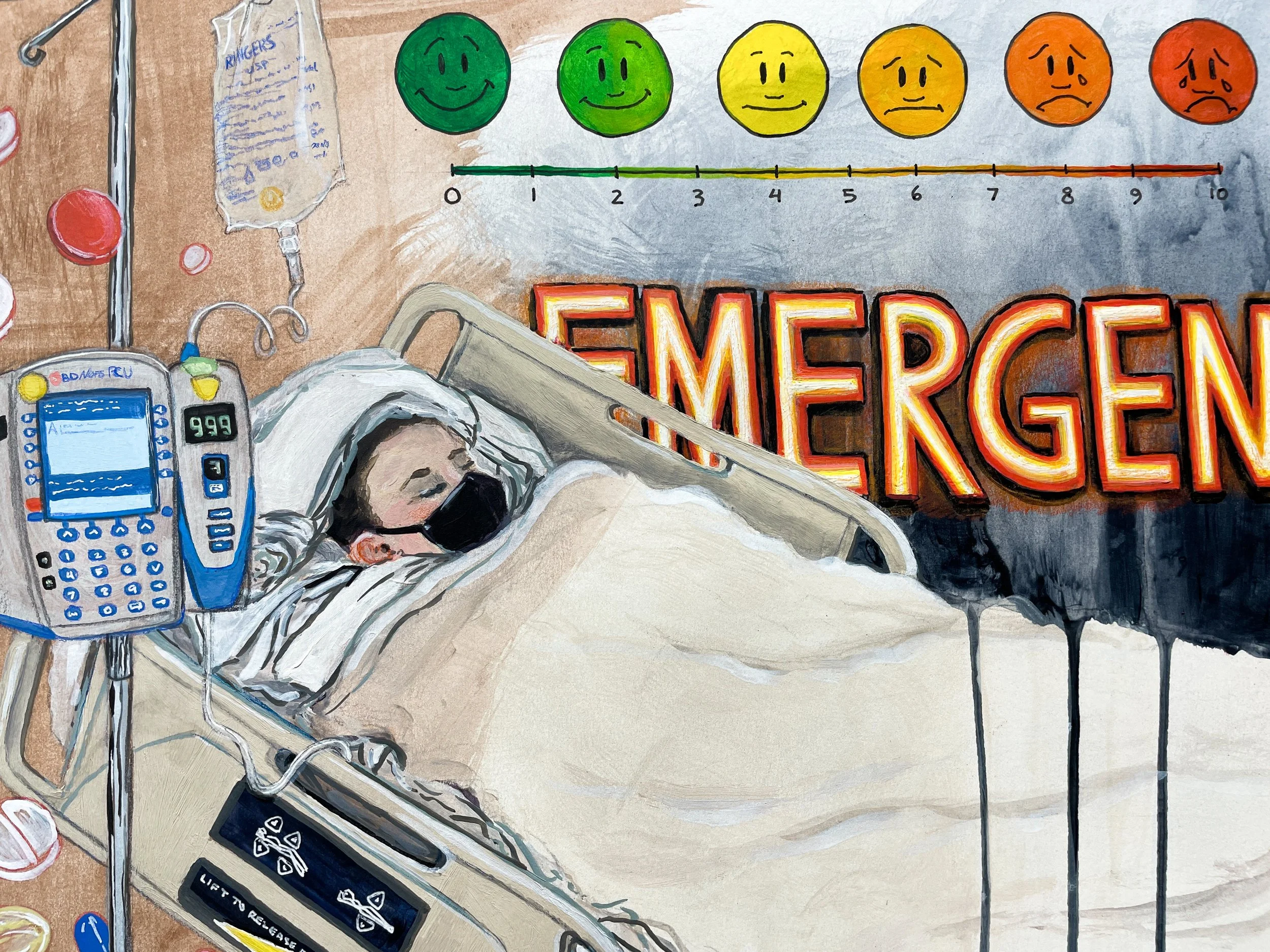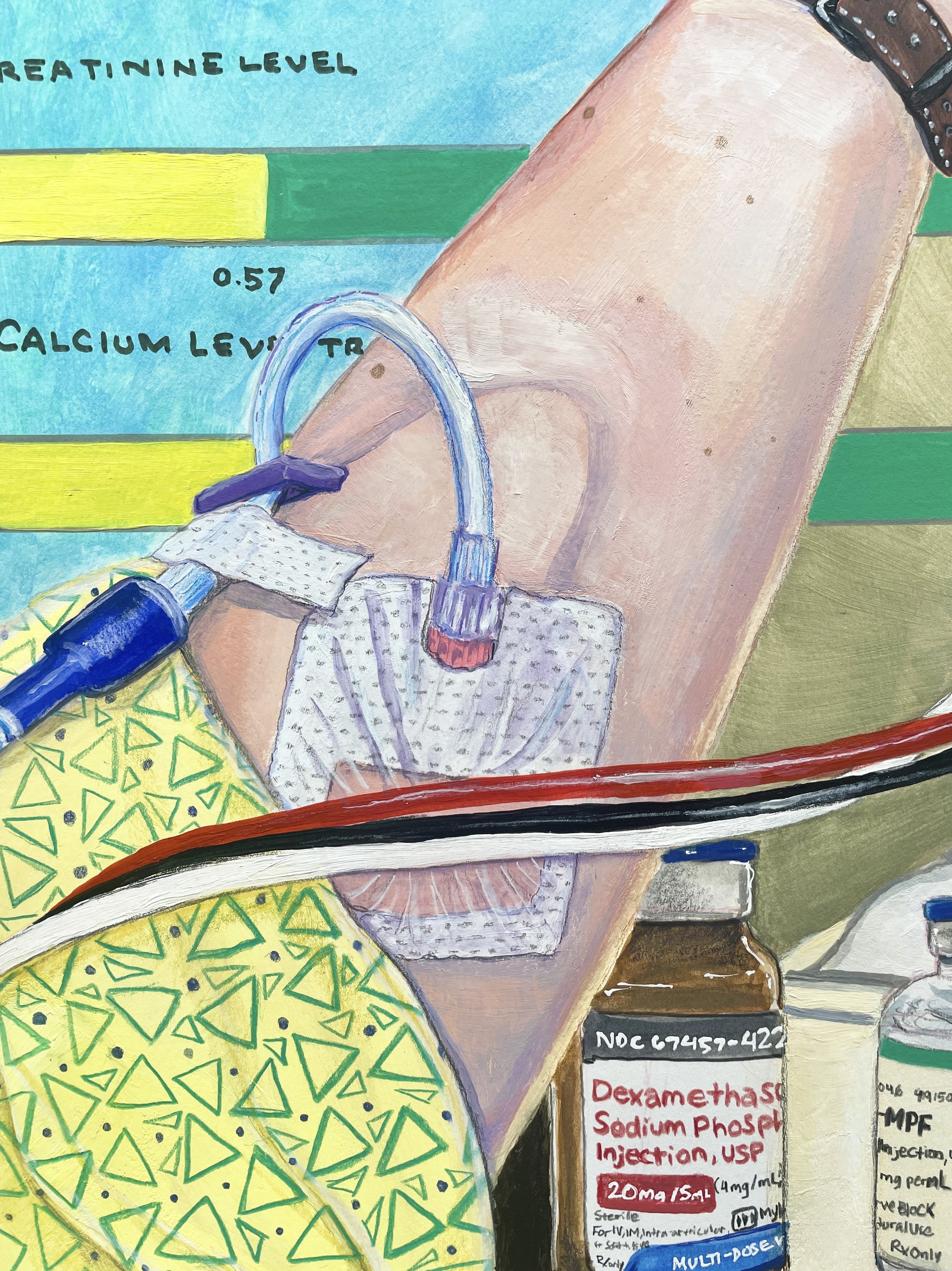 “Emergency Room on a Friday Night” is a painting I made following a particularly rough trip to the ER out in Tennessee. Since I have experienced so much medical trauma over the past several years, the emergency room has become an especially triggering place. Working on this series and making art following these trips has become my way of processing my experiences. In this circumstance, the buildup of medications in my system had reached a toxic level, and it had taken ten attempts to place an IV for fluids and to take blood because I was so severely dehydrated.